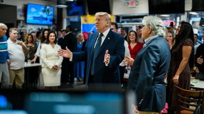 Estampas surrealistas de 2026: Trump anoche en El Arepazo de Miami. Preguntó por venezolanos (no para deportarlos) y presuntamente pidió para llevar. Se revelaron detalles de una nueva conversación suya con MCM